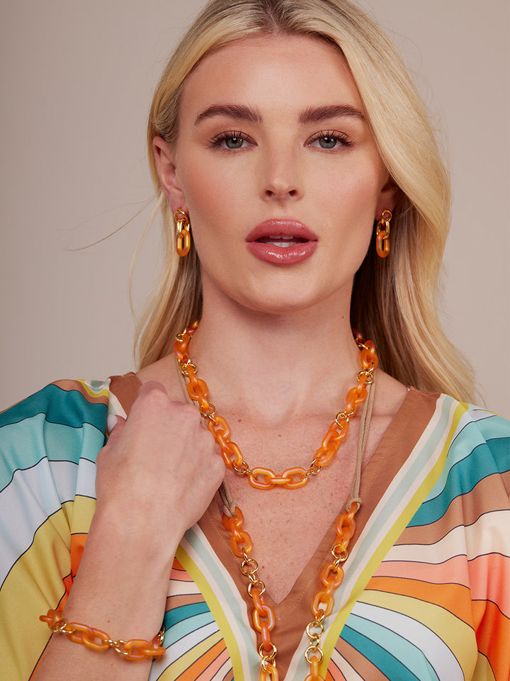 The Lana Necklace features smooth, iridescent oval resin links with golden details. Lightweight and easy to wear, it’s the perfect finishing touch to take your look from simple to standout.