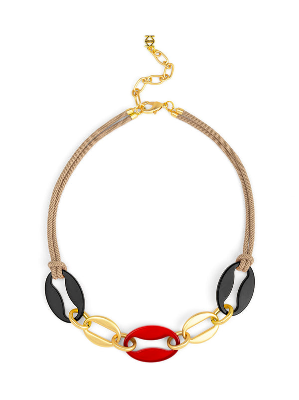 Matte resin links meet gold accents and a soft cord tie in the Mira Mixed Necklace. With its sculptural curves and earthy color palette, this piece delivers artful style with easy, everyday appeal.
