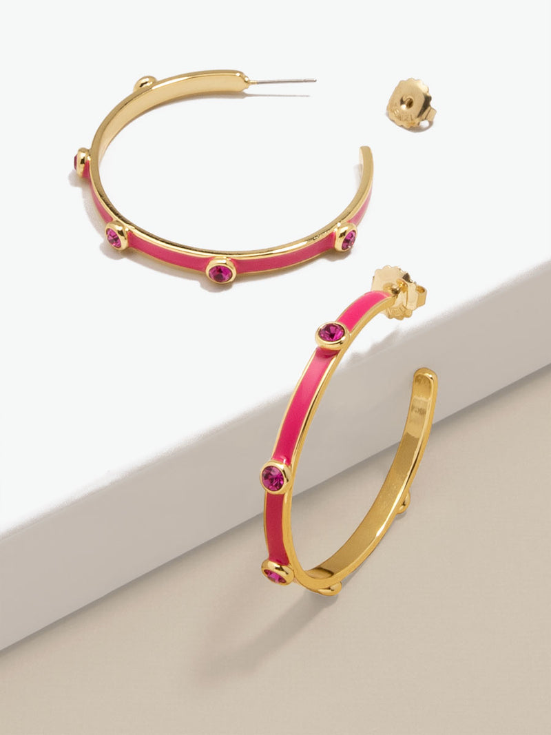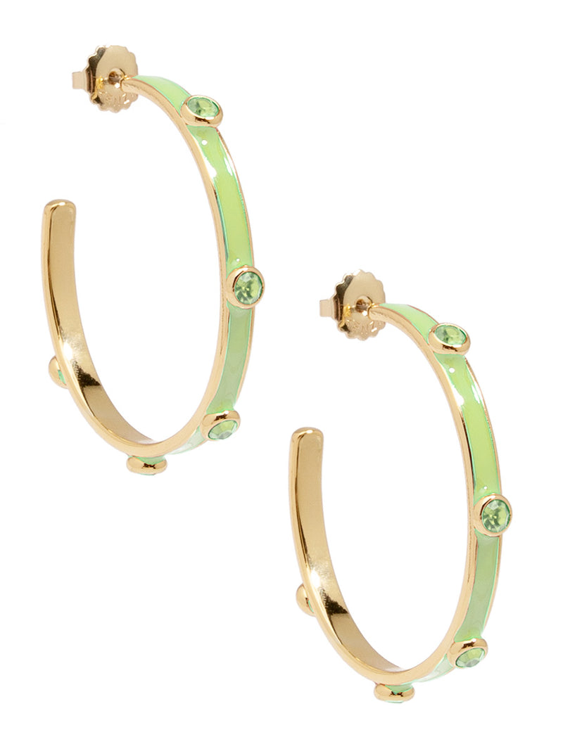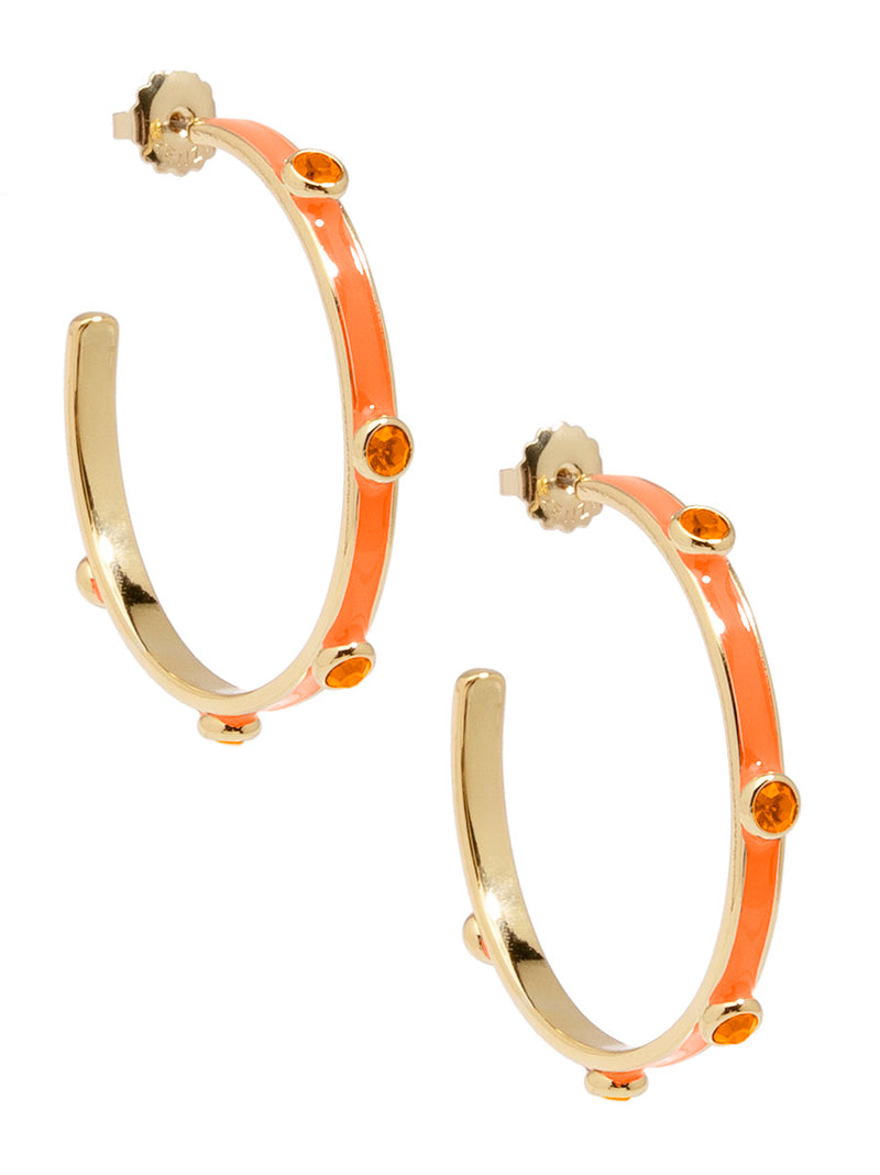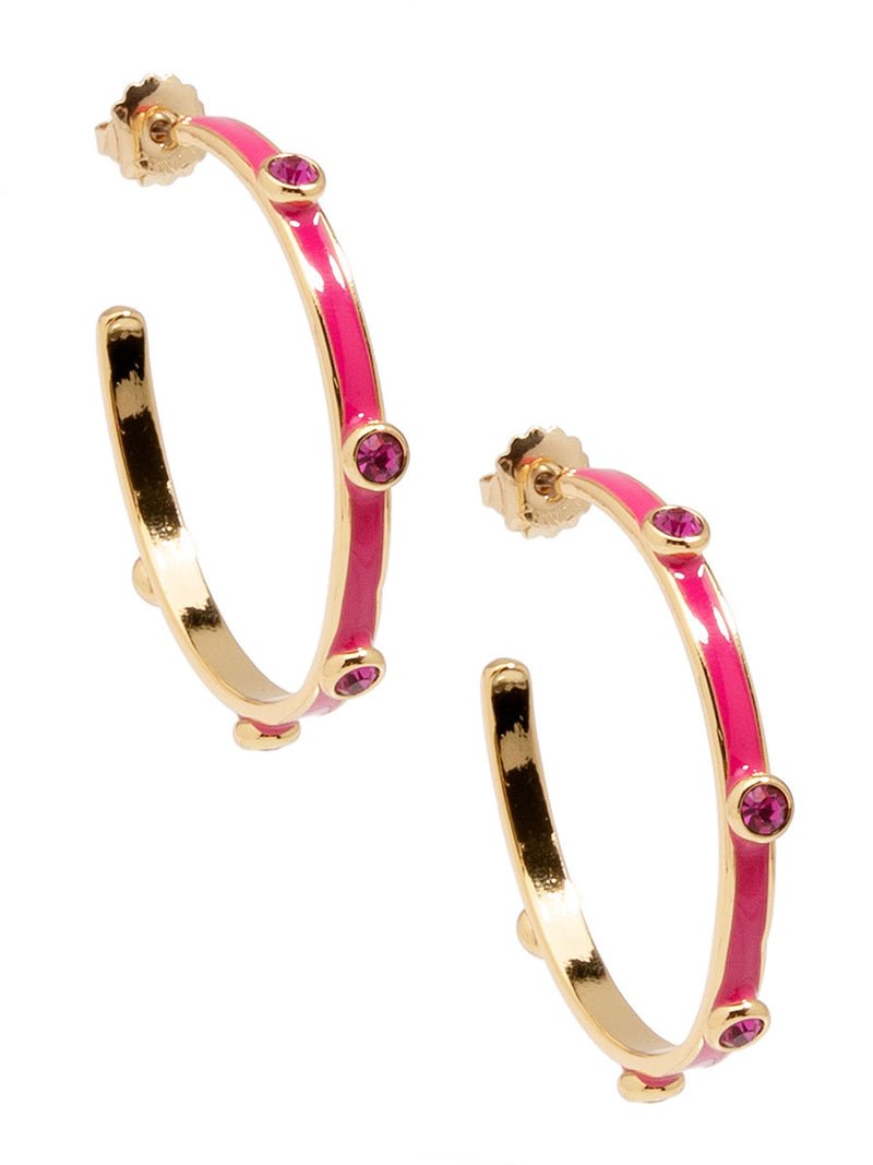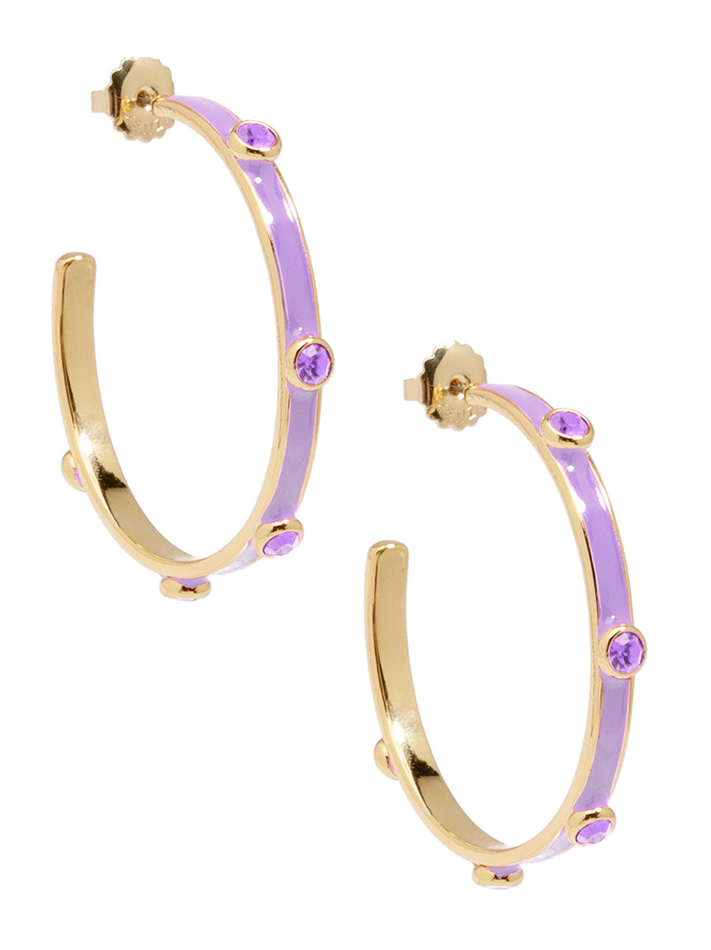 A hoop to remember! Bella features an oversized silhouette designed with colorful enamel coating and matching crystals.