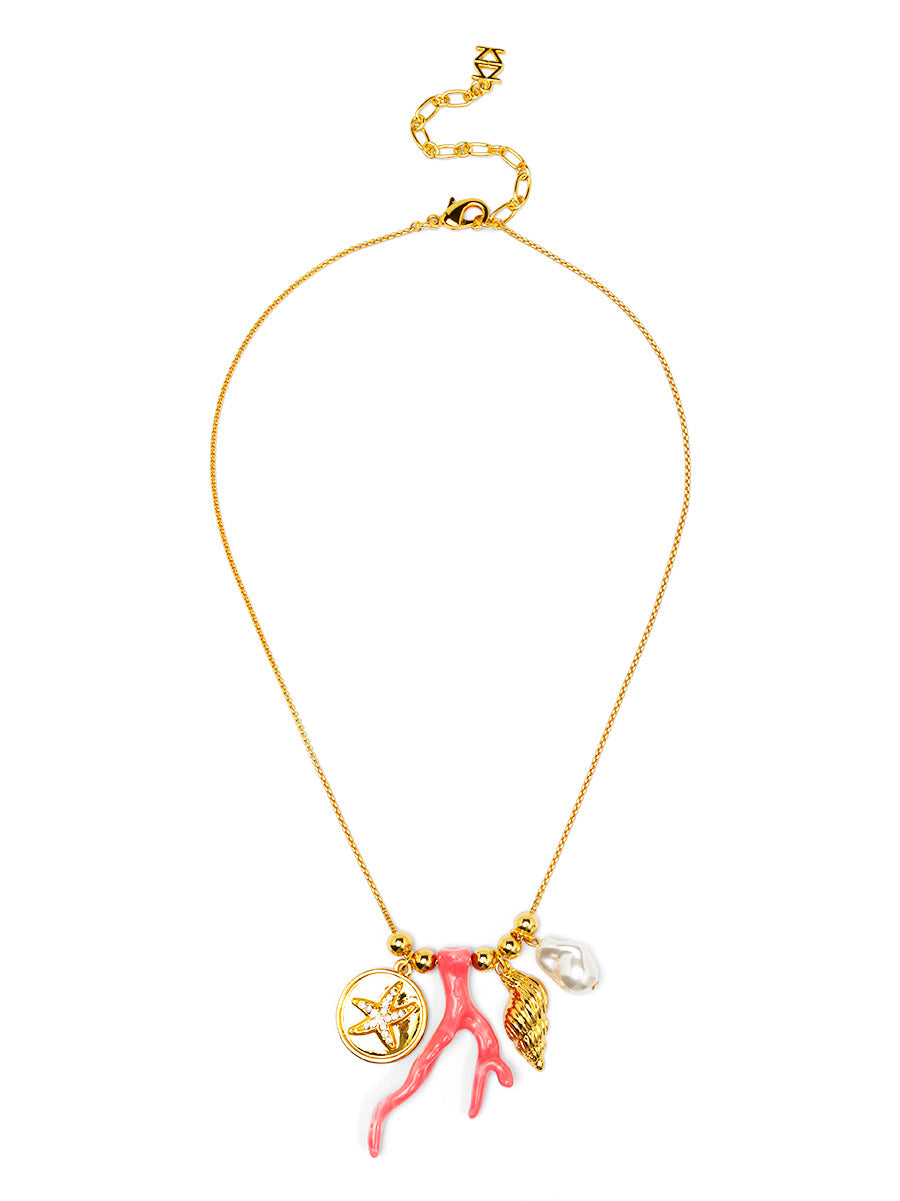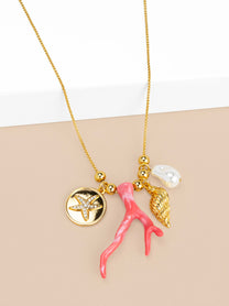 A love letter to the sea in charm form. The Coralie Necklace features a coral branch centerpiece paired with a golden seashell, pearl accent, and textured medallion. It’s layered, lightweight, and effortlessly coastal-chic—a perfect way to carry a little sunshine wherever you go.