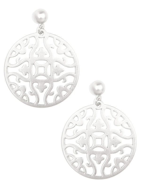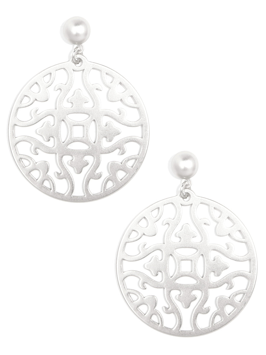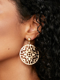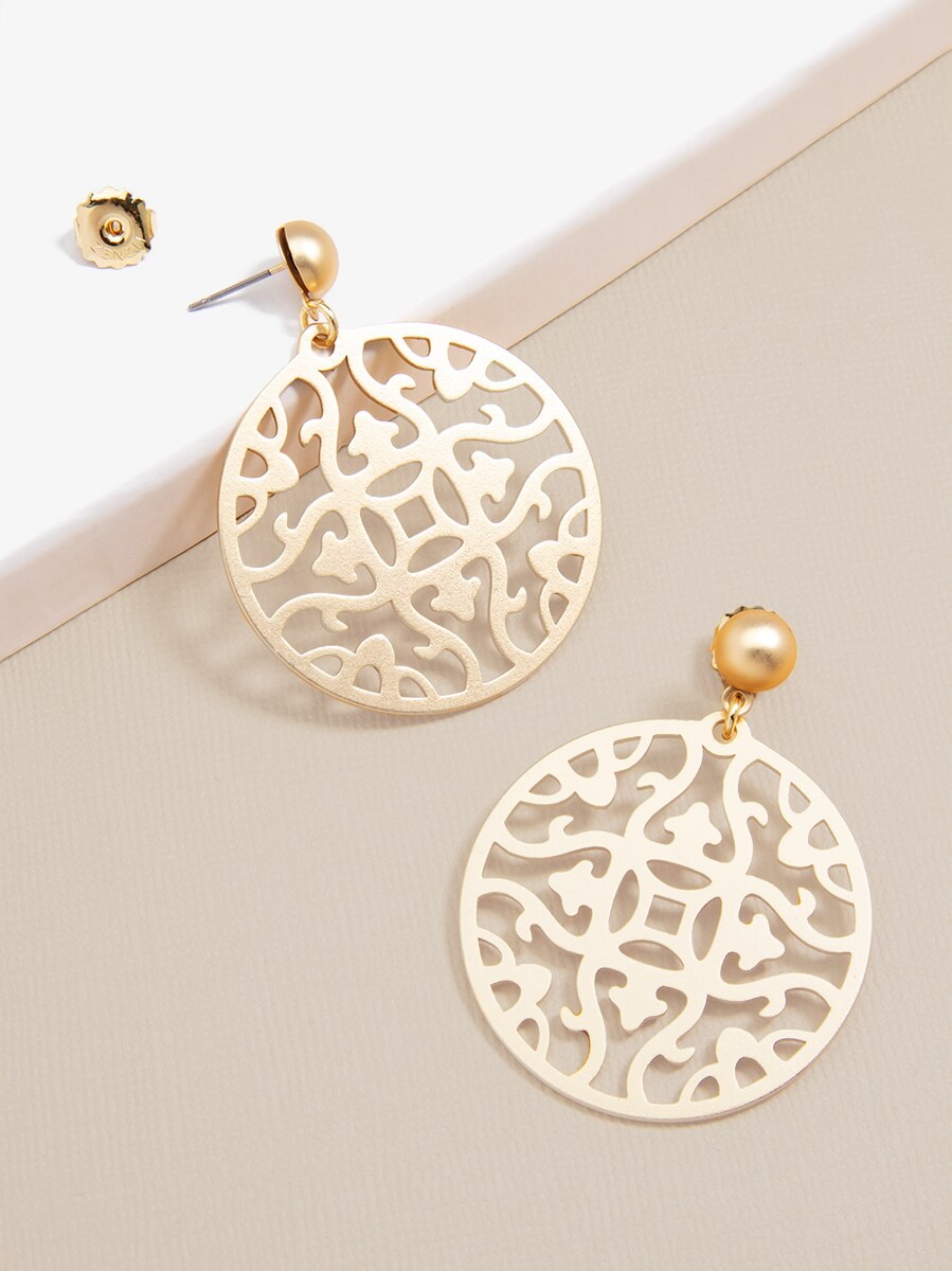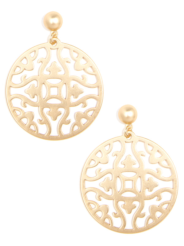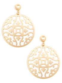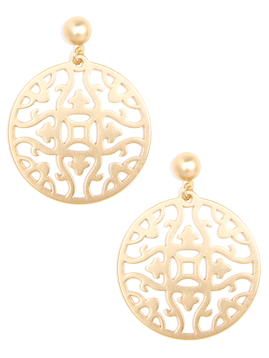 These filigree, circle drop earrings are sure to inspire! Cool cut-out gold-tones makes up these statement-making matte earrings.