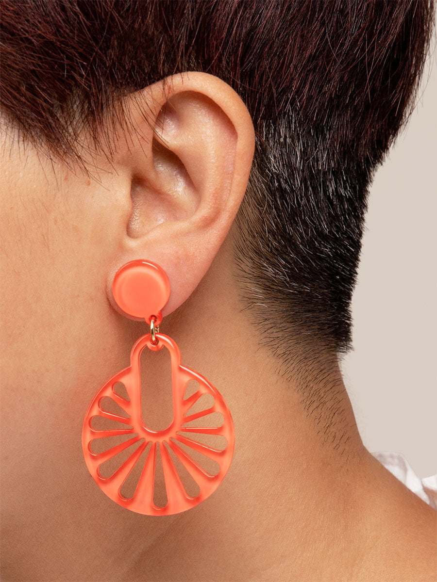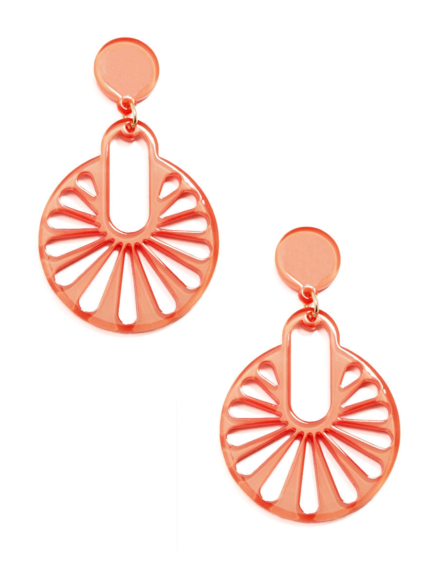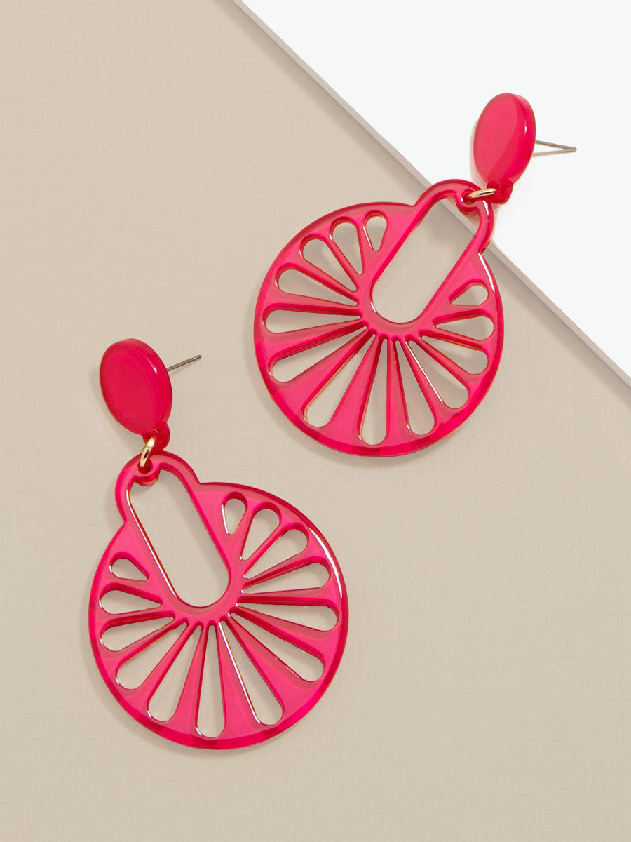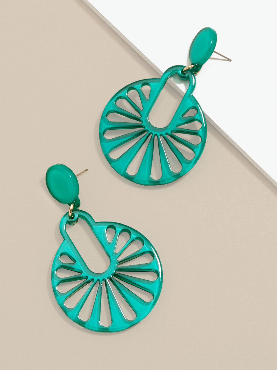 Ready for anything! These beautiful resin drop earrings feature a cutout disk design for a light, airy feel.