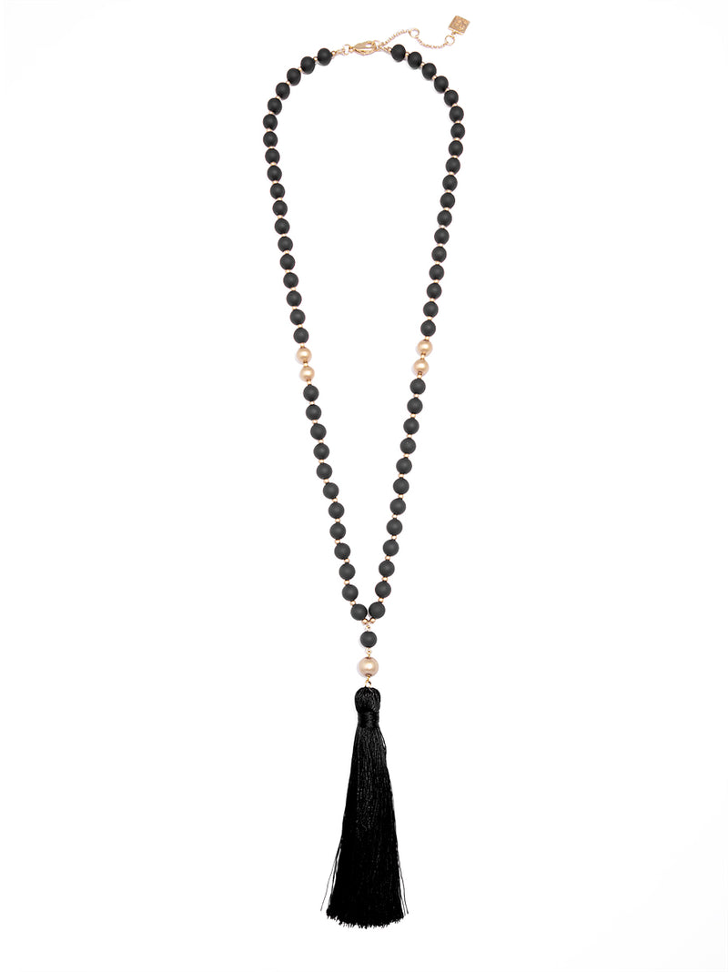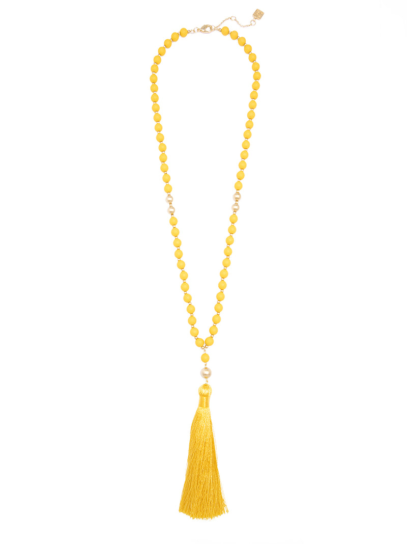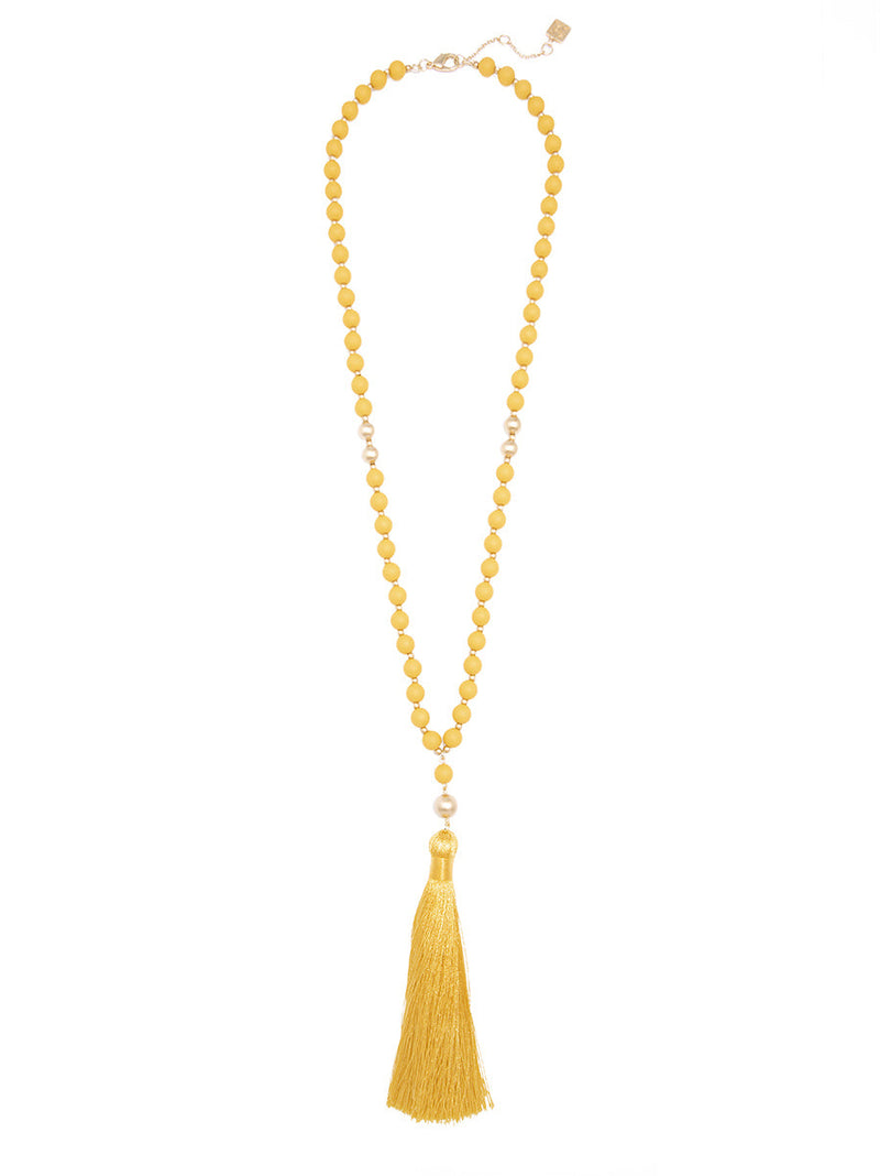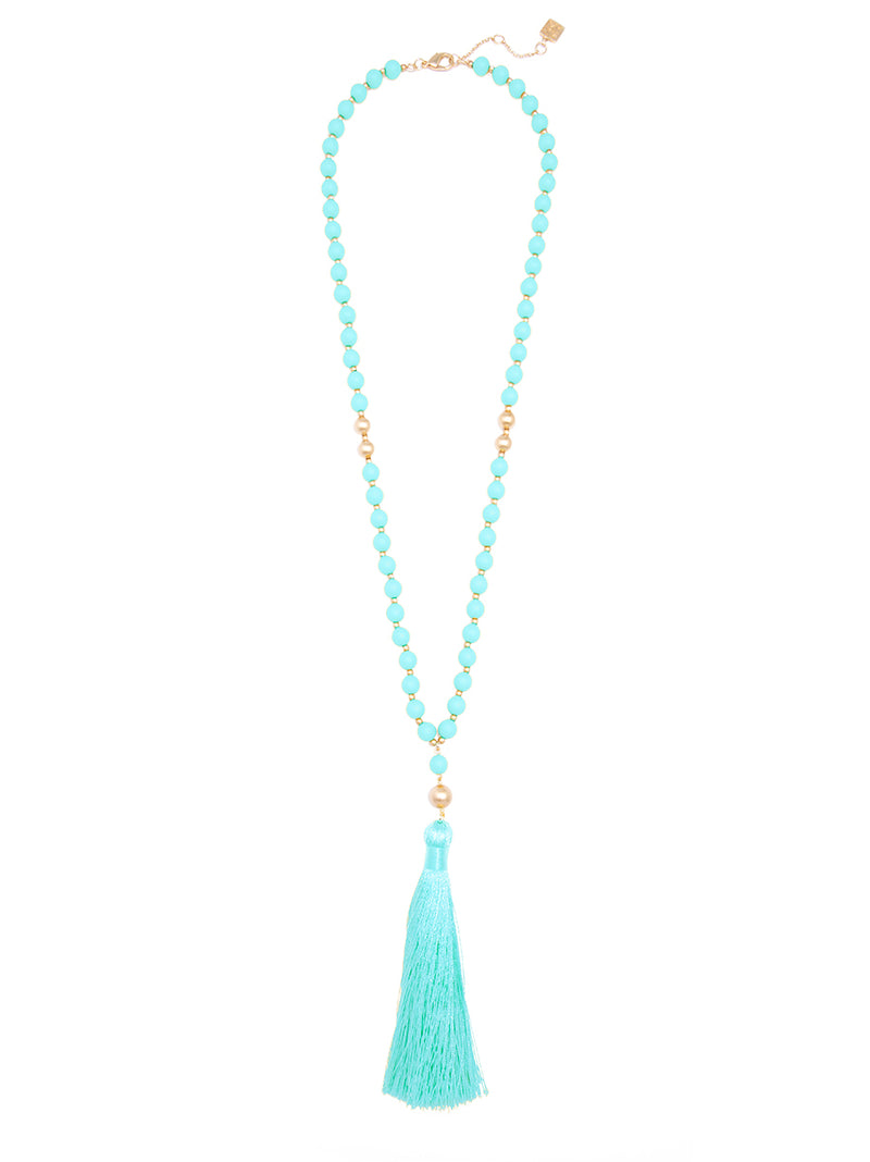 Make any look more colorful with this beaded necklace! Matte resin and metallic beads holds a dangling fabric tassel that is available in a variety of eye-catching hues.