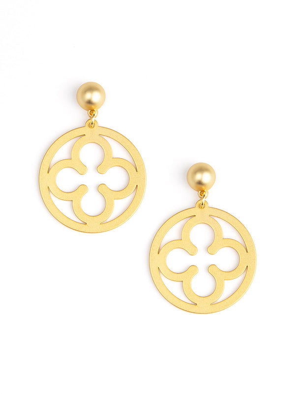 The Florence Large Earring features sculpted clover-cut medallions suspended from sleek gold studs. Lightweight yet eye-catching, they offer a graceful statement with timeless appeal.