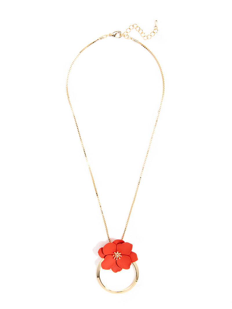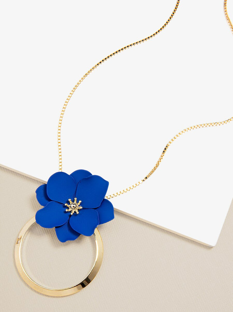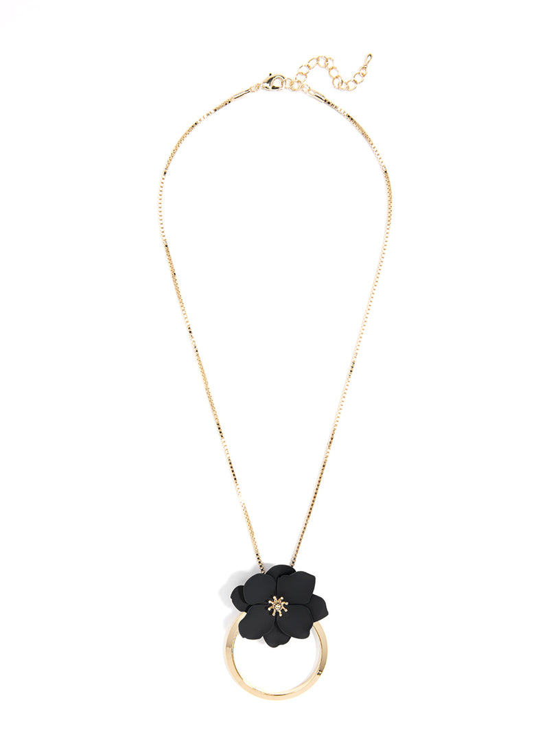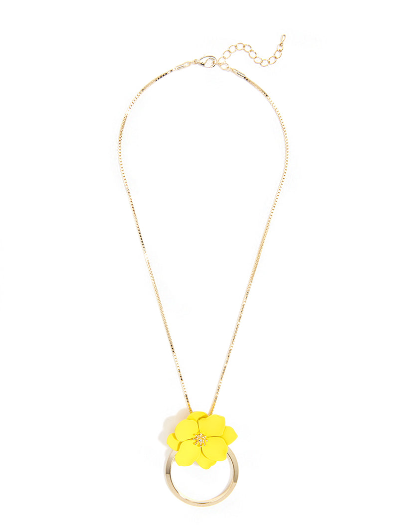 Sweeten your look with this feminine, fun style. This necklace features a hand-painted, metal flower pendant necklace with a shiny, 18k gold-plated ring.