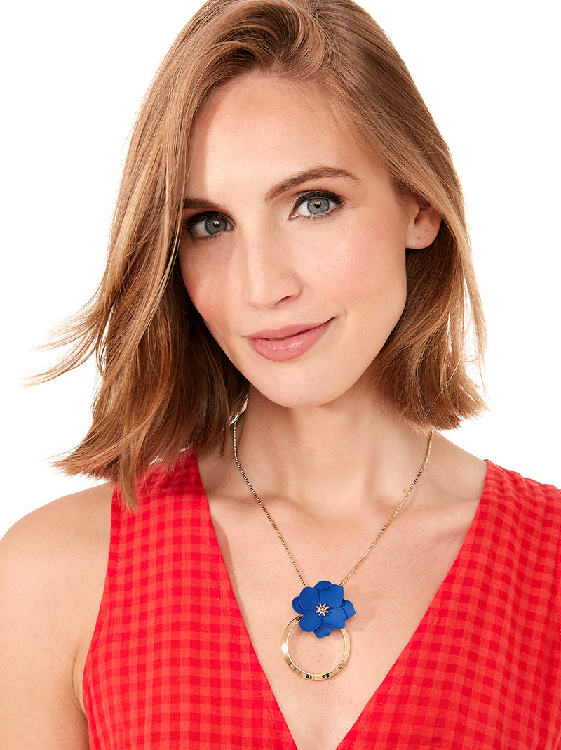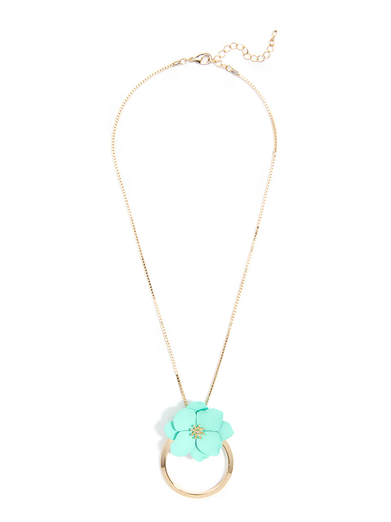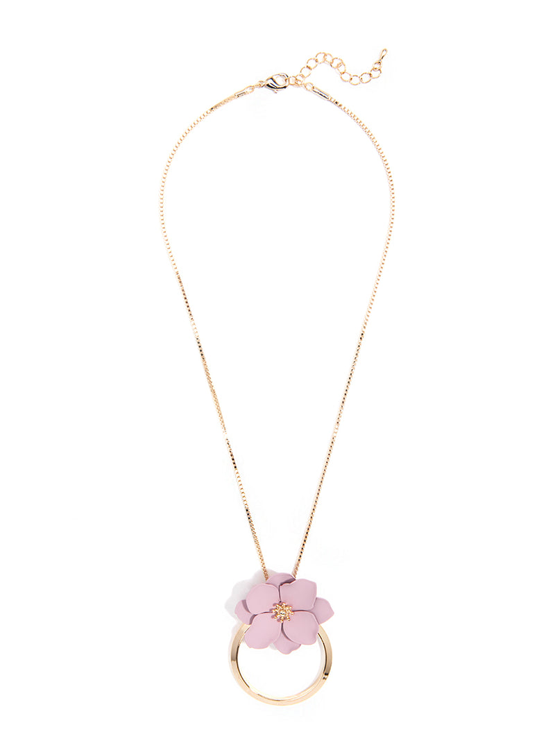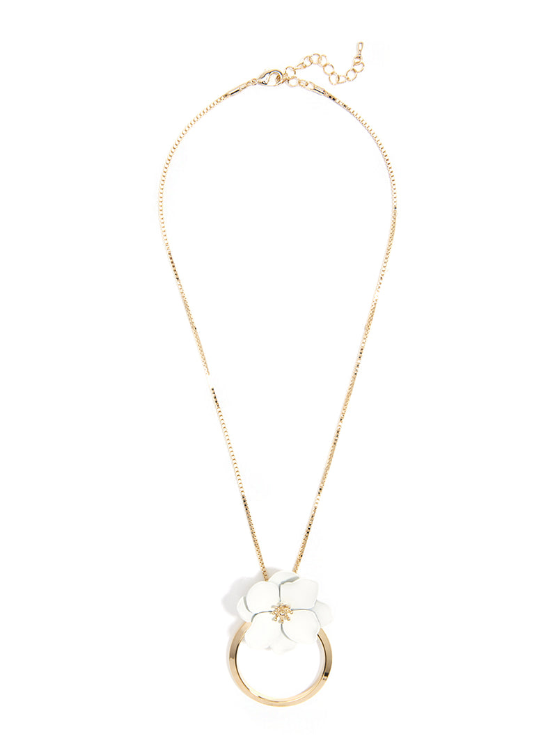 Sweeten your look with this feminine, fun style. This necklace features a hand-painted, metal flower pendant necklace with a shiny, 18k gold-plated ring.