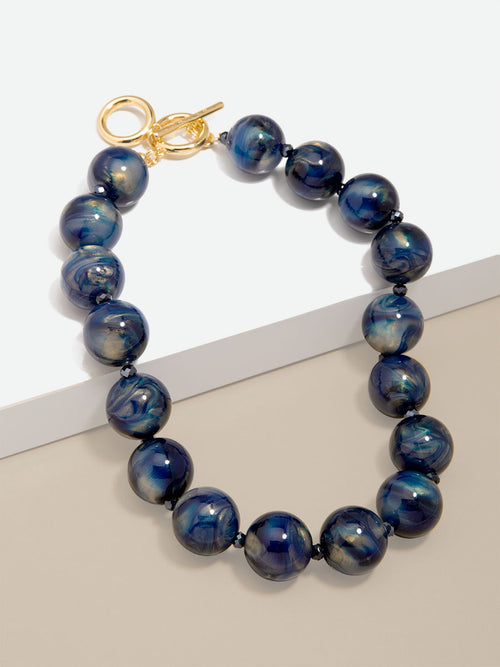 Elevate your everyday look with this statement collar necklace featuring large iridescent beads and a toggle style closure.
