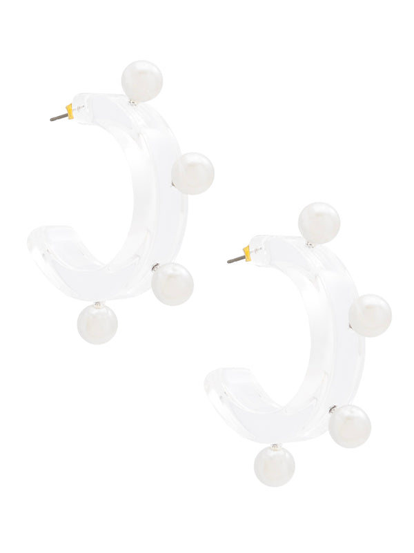 Clear lucite open hoop earring with pearl embellishments.