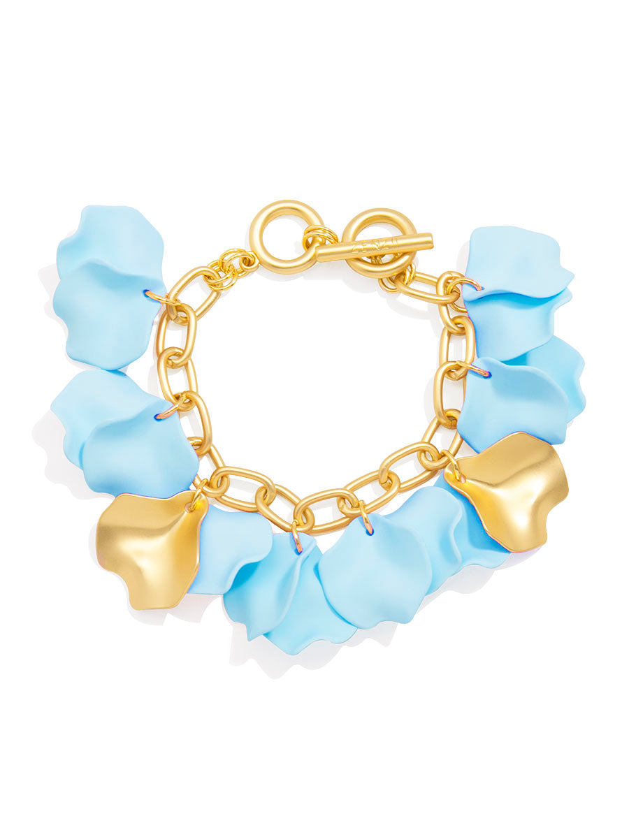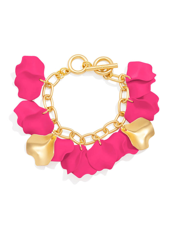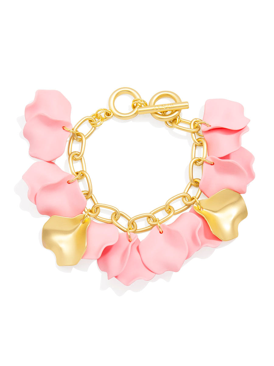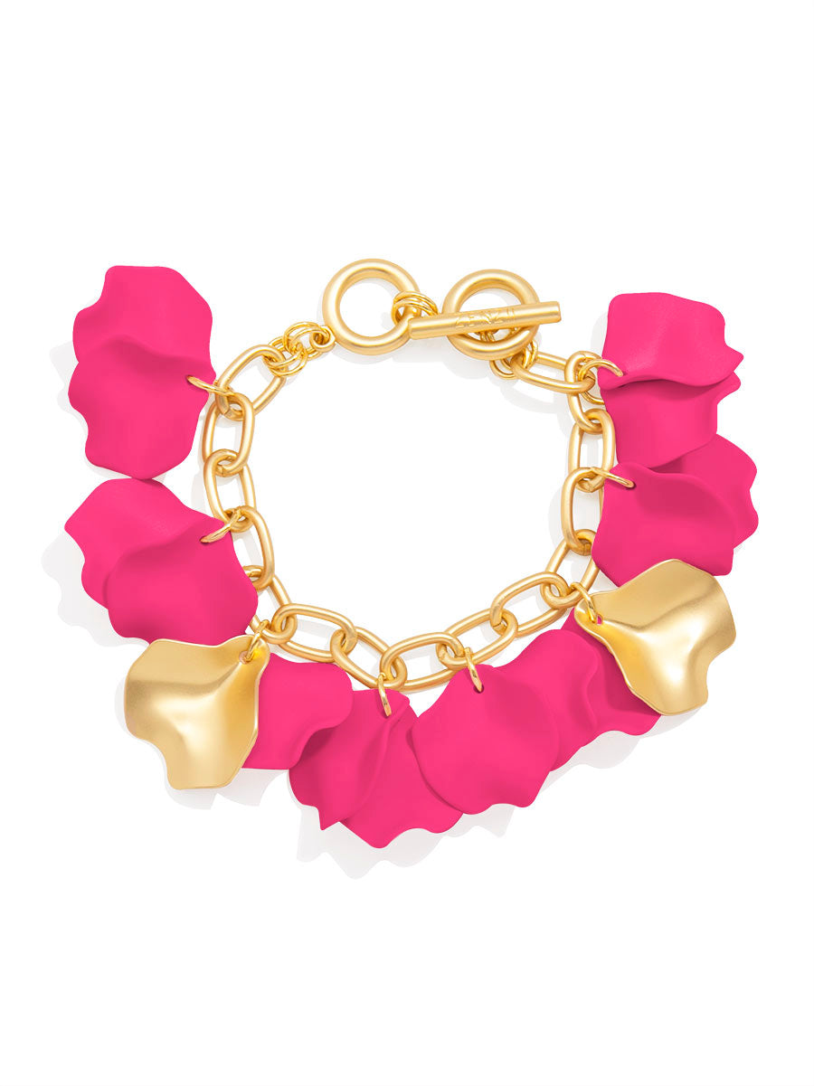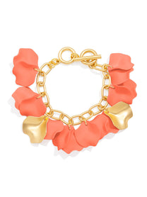 18K gold-plated link bracelet with toggle closure featuring colorful matte resin petals and two 18K gold-plated matte petal accents.