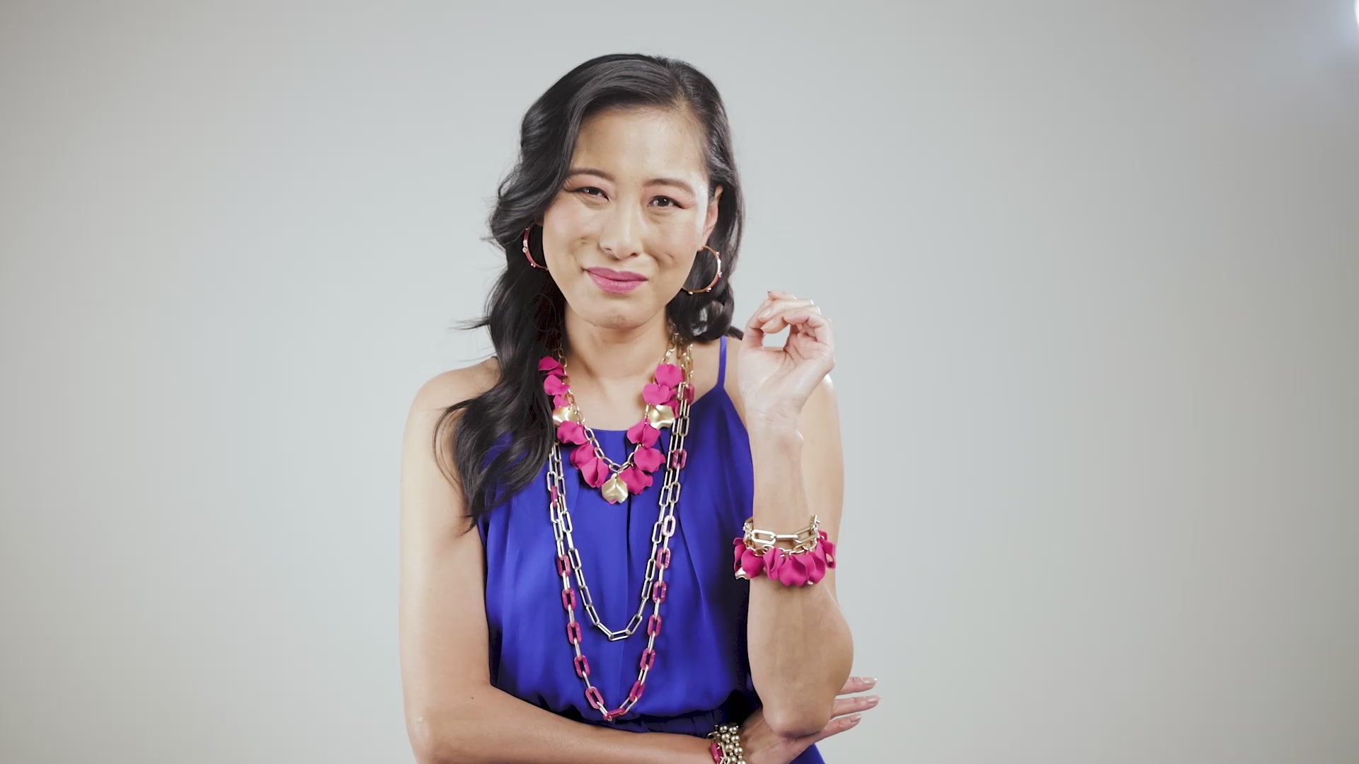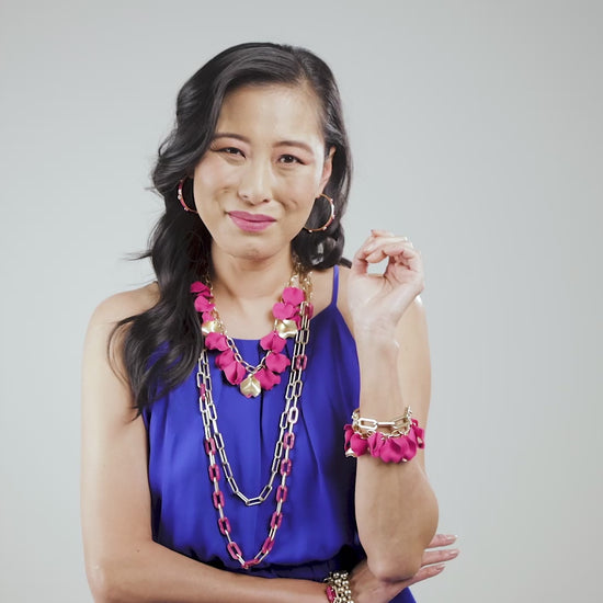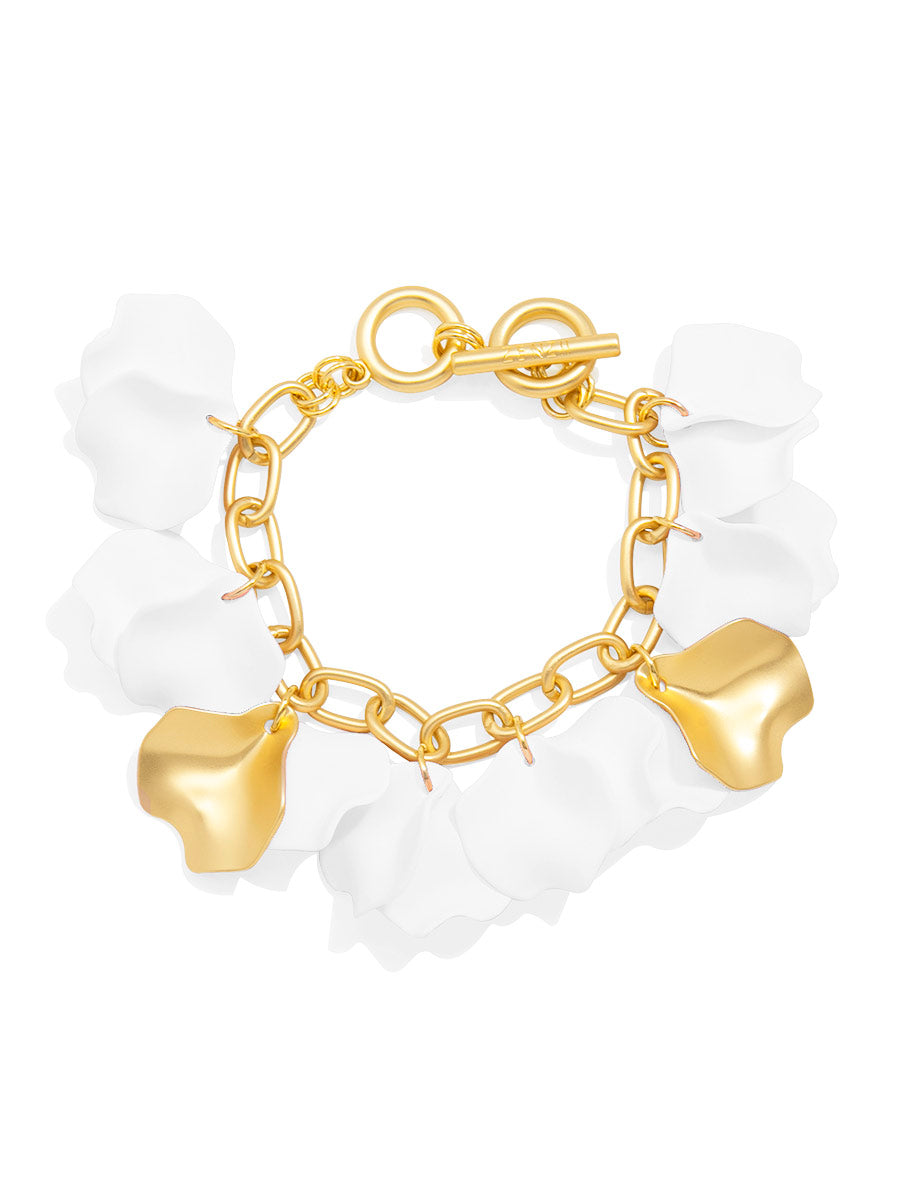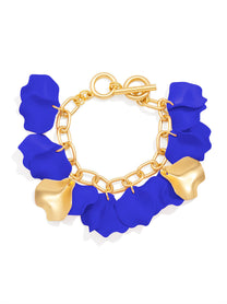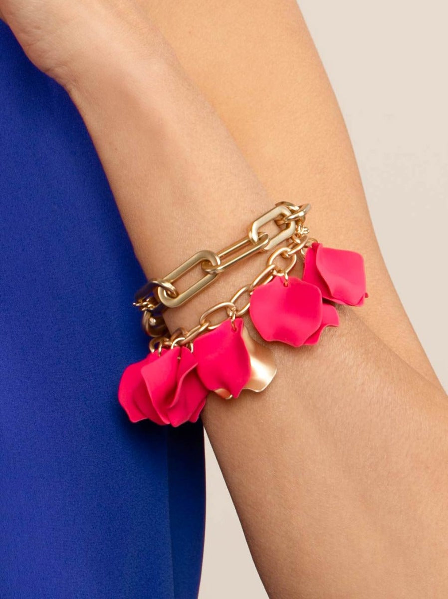 18K gold-plated link bracelet with toggle closure featuring colorful matte resin petals and two 18K gold-plated matte petal accents.