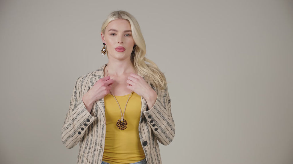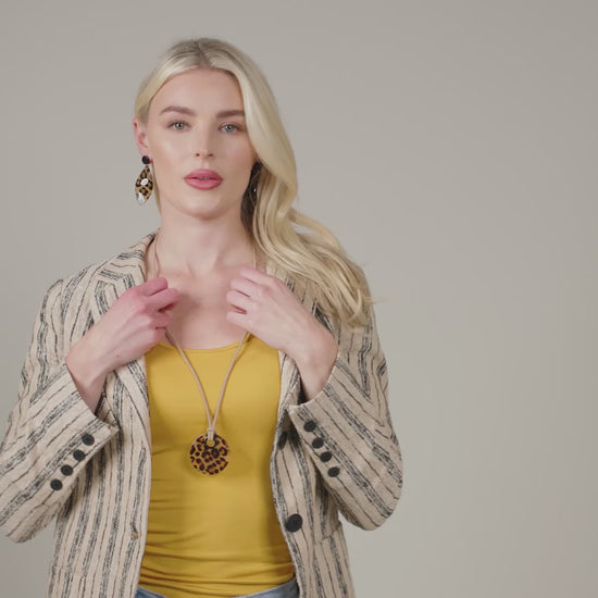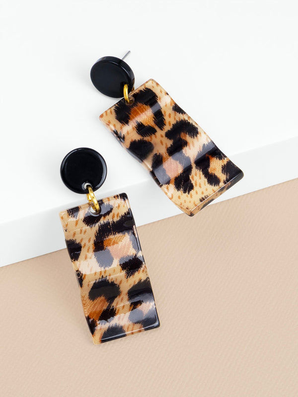 Wavy resin rectangle in leopard print suspended from a black stud. Graphic shape with a wild edge.