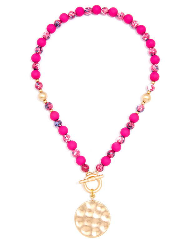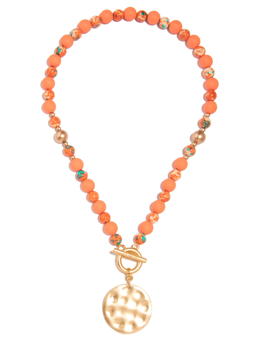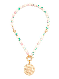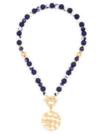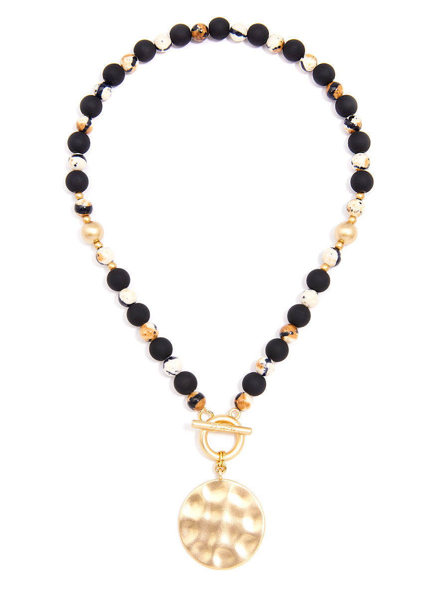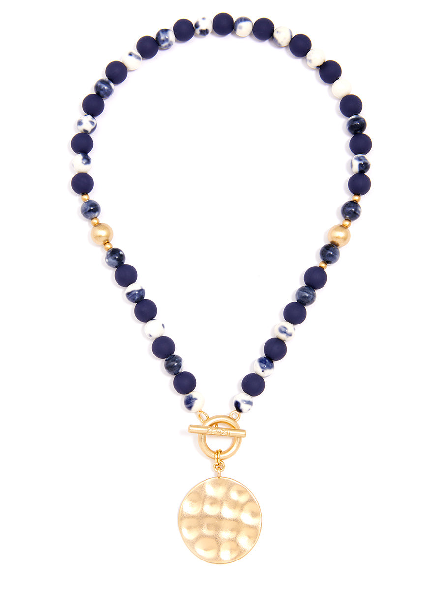 The most charming collar necklace features a hammered medallion and toggle closure for easy wear.